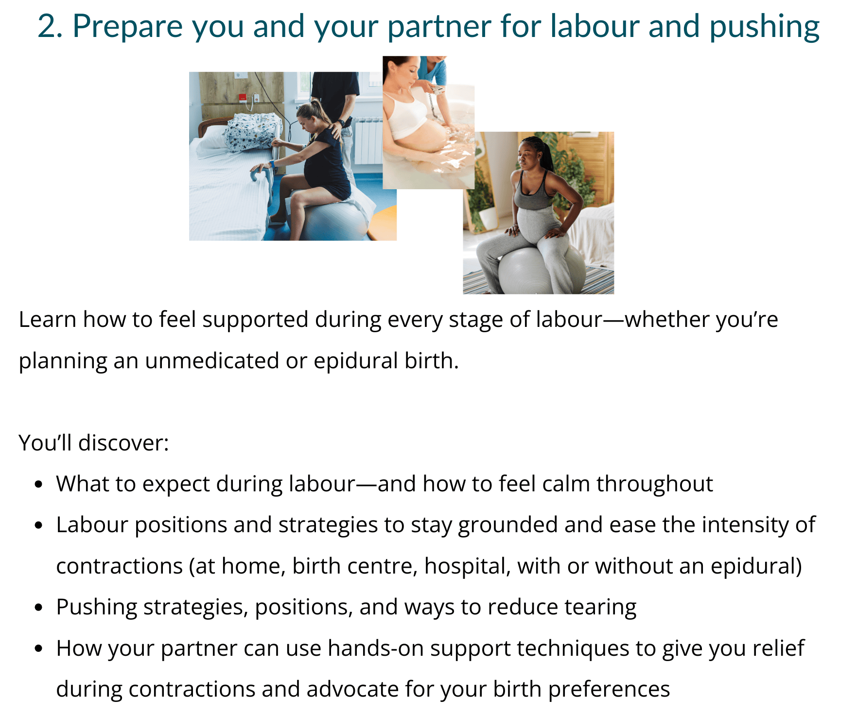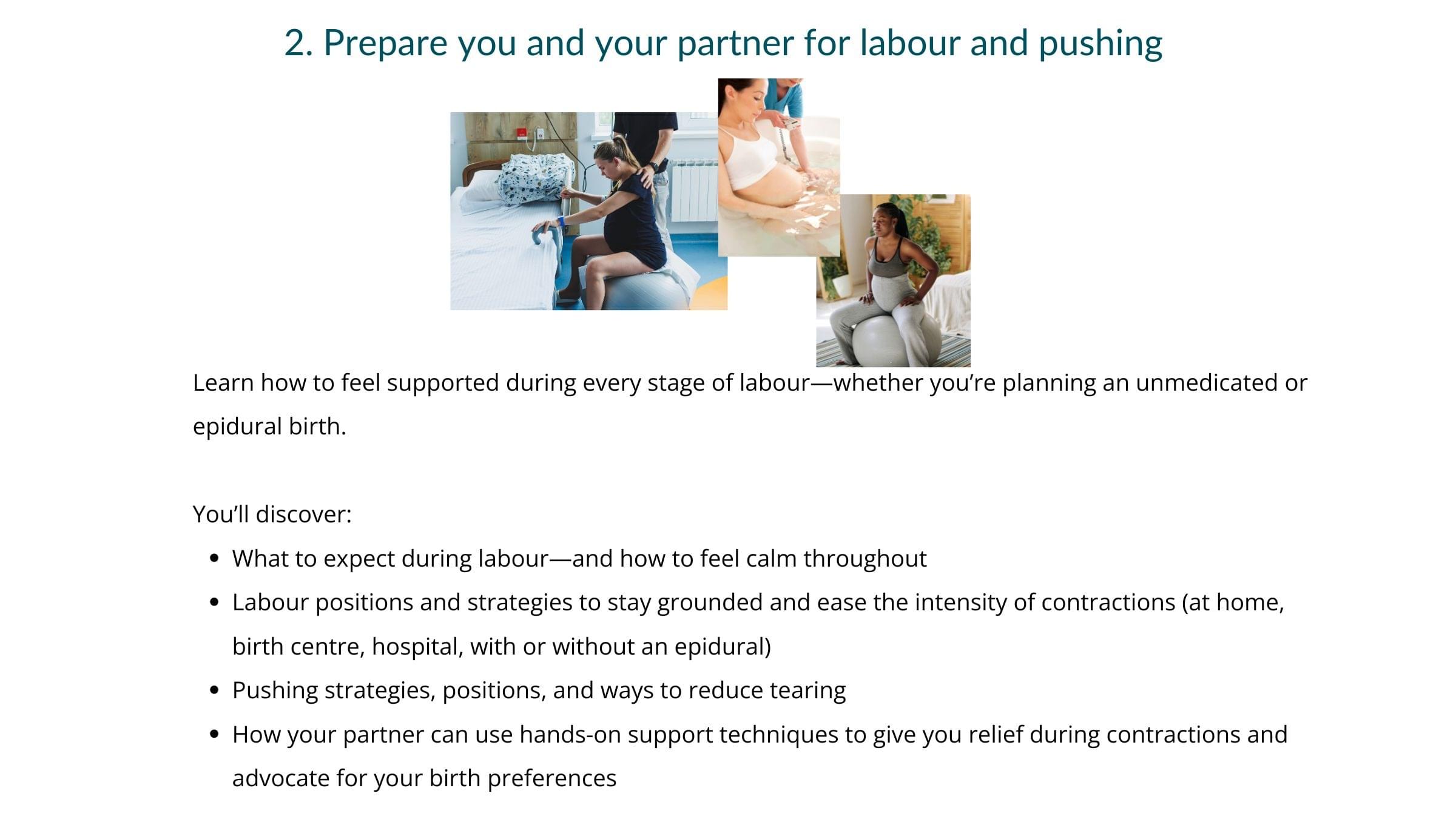 Week 4: Create your own birth preferences (this is more effective than a birth plan), address your fears and concerns about birth, mindset strategies for labour, how to make informed decisions for you and baby during birth, helpful labour strategies and positions for both medicated and unmedicated birth. (Module 5)