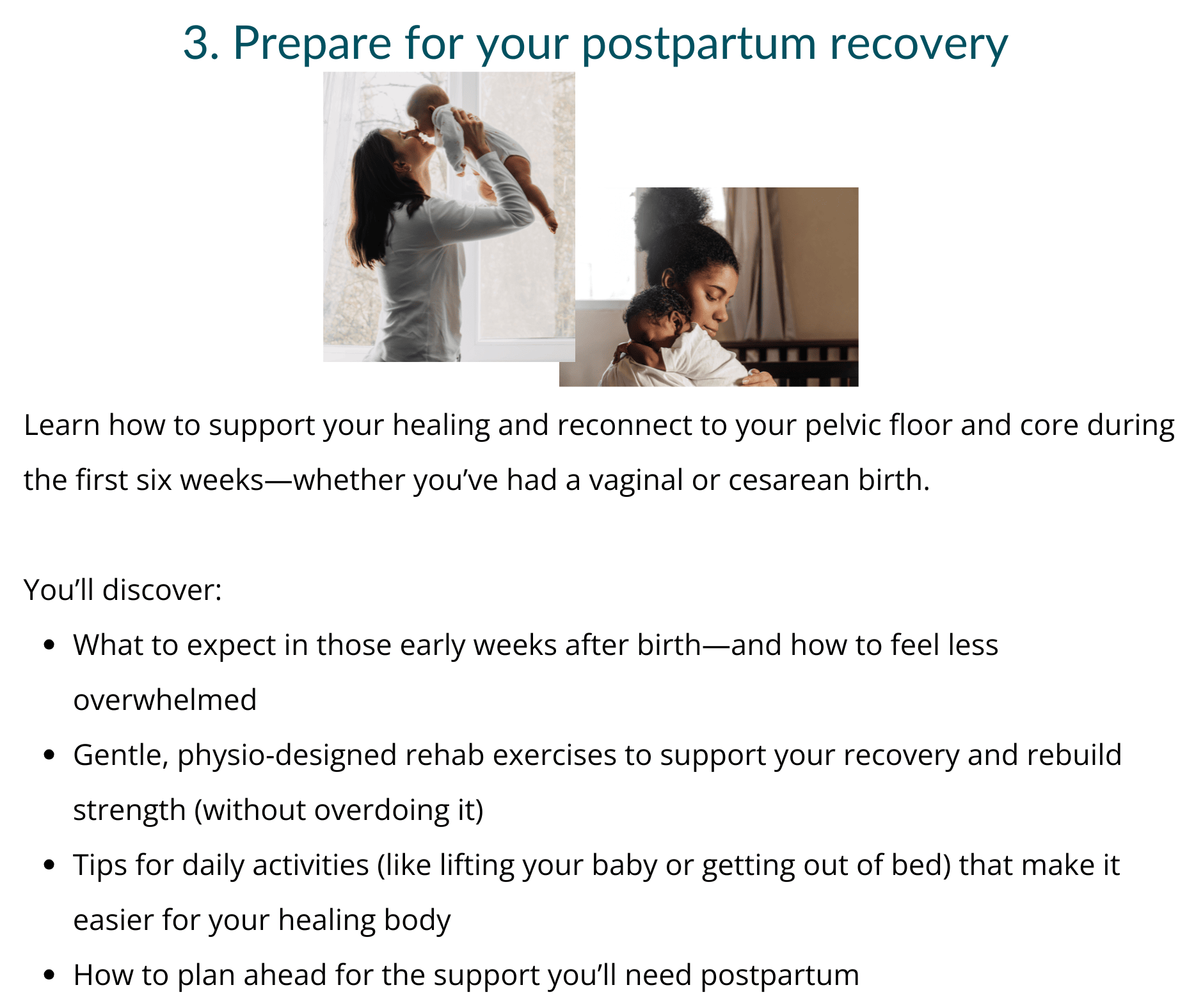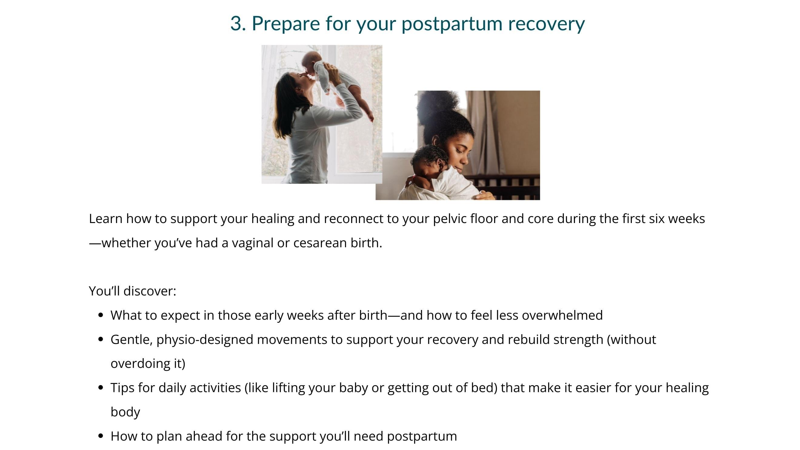 Week 7: Prepare ahead of birth with postpartum strategies and exercises for a more efficient first 6 weeks of your recovery and to understand the steps to get back to exercise you love feeling your best! (Module 8 & 9)