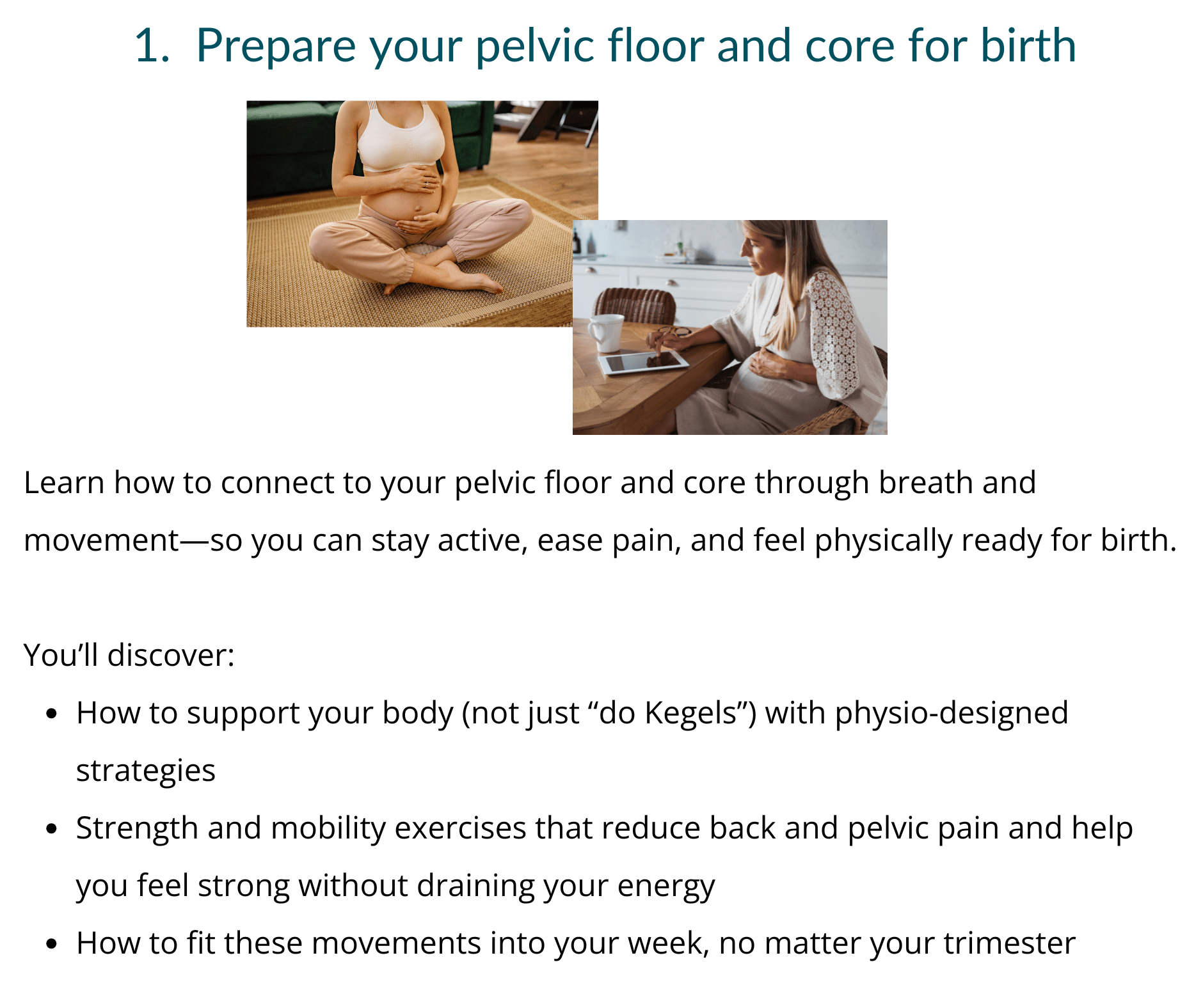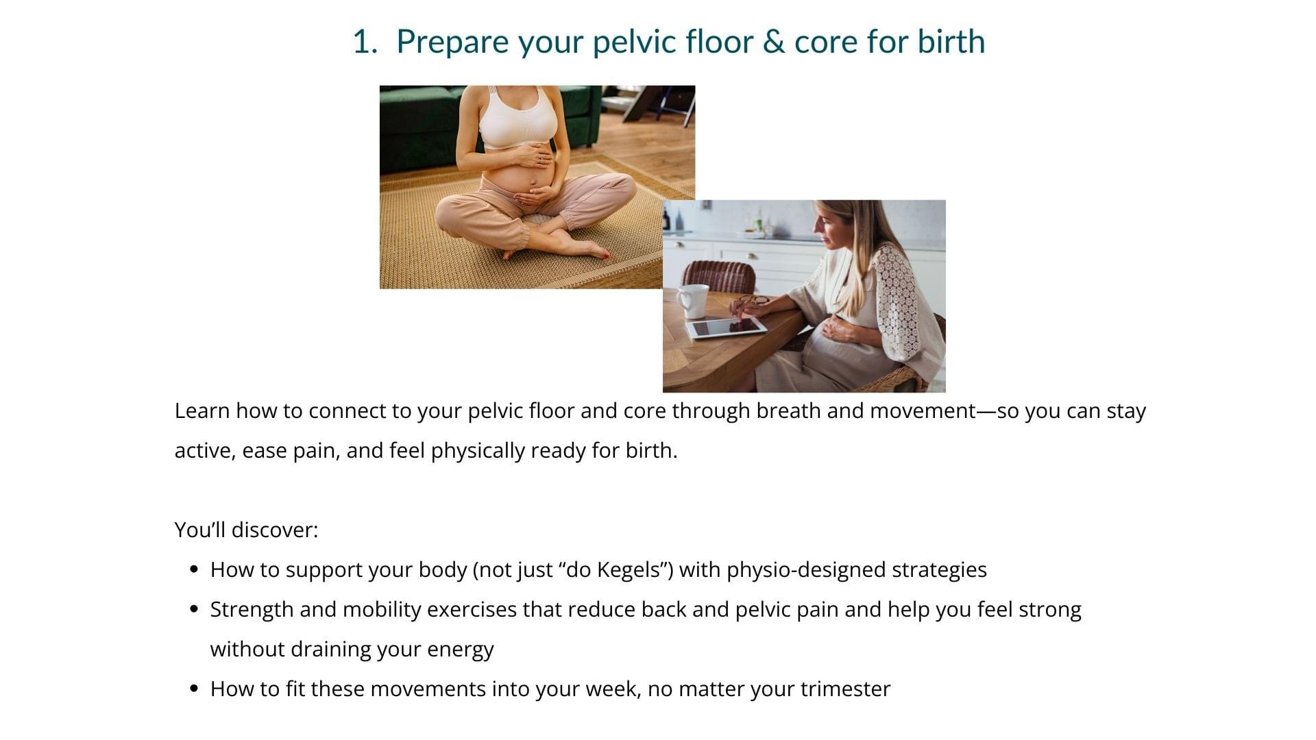 Week 1: Posture and breathing strategies to support you and baby throughout pregnancy and how to connect your breath to your pelvic floor for both strengthening in pregnancy and relaxing for labour and pushing. (Module 1 & 2)